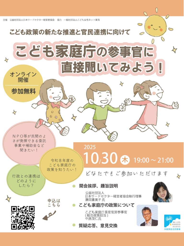 こどもを取り巻く課題は複雑化、多様化、深化し、政府・行政がすべての課題にきめ細かく対応することは事実上困難なものになってきています。令和8年度のこども家庭庁の政策について、こども家庭庁の参事官からお話をお聞き学びます。またNPO等が民間のよさが発揮できる委託事業や補助金制度などの在り方についても議論を深めます。